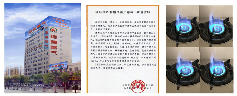 輕烴冷制燃氣,1993年前研究的也是加溫制氣,做了107戶供氣,輕烴加溫36度以上就產(chǎn)氣,天氣冷,每天多次排殘液、管道每天排3~5(水)桶凝液(輕烴),火勢不穩(wěn),也威脅安全,準備放棄改煤氣;國務院要求發(fā)展油制氣,研究不加溫試試,根據(jù)汽車用水降溫,摩托車用風降溫不拉缸原理啟示,不兌任何添加劑,將輕烴完全汽化,解決了殘液、凝液問題,專門改裝了1梯6戶,室外明管不保溫,在零下23度沒有凝液,經(jīng)完善達到了供氣穩(wěn)定的目的,承建了多個小區(qū),常溫低壓供氣,使用穩(wěn)定,找不到任何缺點;于2003~2005年八次向黨中央,國務院、有關部委報《喜報》:得到了大力支持,定為《國家鼓勵發(fā)展的資源節(jié)約綜合利用和環(huán)境保護技術項目》、《免稅項目》和《城市燃氣》。